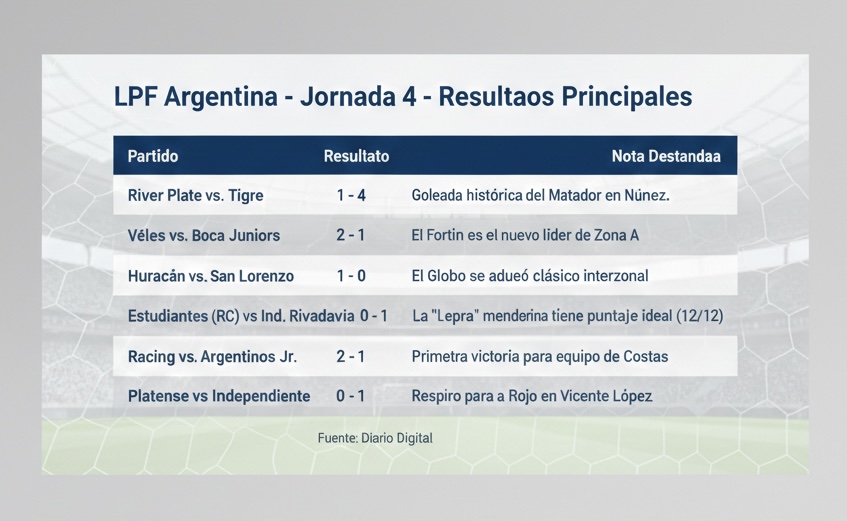 La mayor sorpresa de la fecha se produjo en el Monumental, donde Tigre dio el golpe histórico al golear 4-1 a River Plate. Con una actuación estelar de Ignacio Russo (autor de un doblete), el «Matador» dejó en silencio a la parcialidad millonaria y se ubicó como escolta en la Zona B. En la misma zona, Independiente Rivadavia de Mendoza continúa con su racha histórica: venció 1-0 a Estudiantes de Río Cuarto y se mantiene como el único equipo con puntaje perfecto en lo que va del certamen.