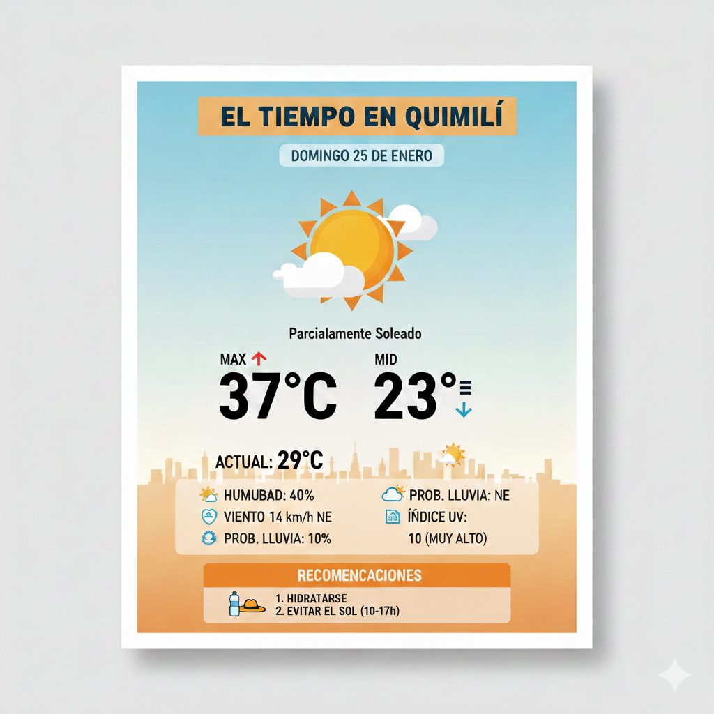 La ciudad de Quimilí atraviesa una jornada de temperaturas extremas. Tras una mañana que comenzó cálida, el termómetro continuará subiendo, consolidando un domingo típico de verano santiagueño.